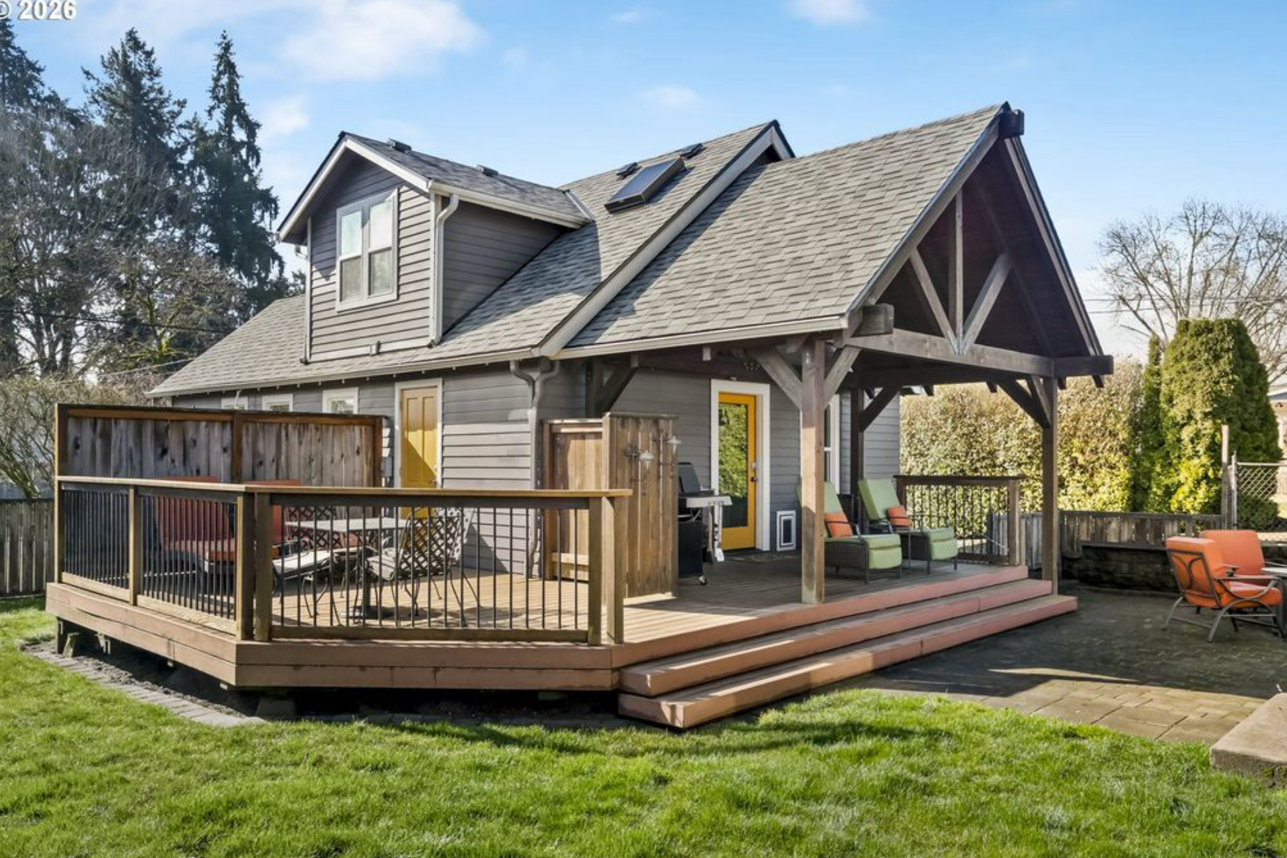 A serene suburban retreat near Sellwood and Lake Oswego, this furnished 2‑bed, 2‑bath home offers natural light, comfort, and an expansive private deck with seating, a covered lounge, fire-pit and gas grill. Enjoy modern perks like EV charging, heated bathroom floors, and smart entry.